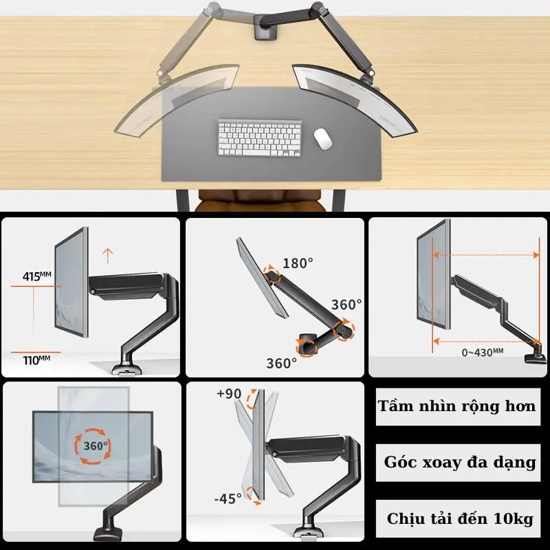 Với khả năng điều chỉnh góc nghiêng, xoay ngang, xoay dọc linh hoạt, giá treo giúp bạn dễ dàng tìm được vị trí làm việc thoải mái nhất, giảm thiểu tình trạng mỏi cổ, vai gáy. Đồng thời, thiết kế gọn gàng, tiết kiệm diện tích giúp bàn làm việc trở nên ngăn nắp và chuyên nghiệp hơn.