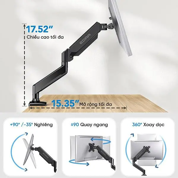 Giá đỡ màn hình máy tính E-Dra EAM7301 cho phép xoay, nghiêng và điều chỉnh độ cao theo nhu cầu sử dụng, giúp bạn có góc nhìn thoải mái nhất, hạn chế mỏi cổ và đau vai gáy khi làm việc lâu dài. Đây là một giải pháp lý tưởng cho dân văn phòng, lập trình viên và game thủ.